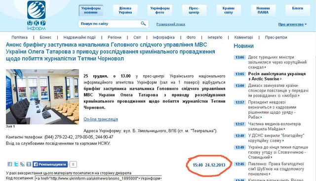 Украинское государственное информационное агентство "Укринформ" разместило анонс пресс-конференции о расследовании избиения Татьяны Чорновол, еще вчера до нападения на журналистку.