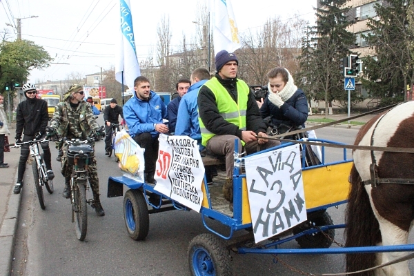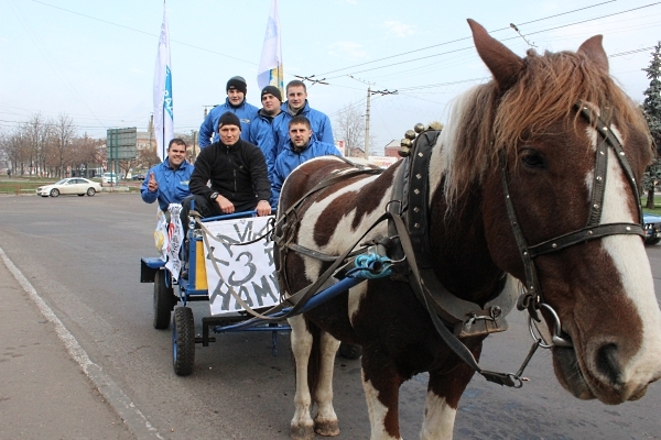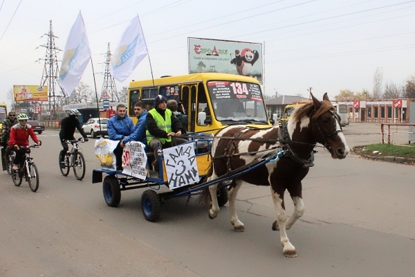 Народный депутат Украины Андрей Табалов и общественная организация "Рідний Кіровоград" ударили по транспортной реформе. Активисты и политик проехались на гужевой повозке по городу. Повозку украсили номерами ликвидированых маршрутов.