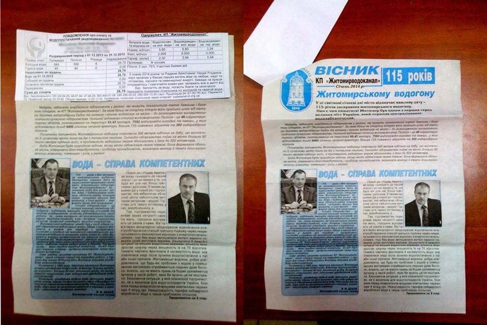 Подвиги Житомирського міського голови тепер на квитанціях водоканалу. До рахунків Житомирського водоканалу причепили газети з мером Володимиром Дебоєм.