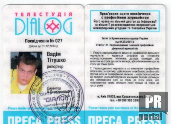 Соответственно, журналистское удостоверение Титушко является недействительным. Также на корочках Титушко стоит фамилия директора «Диалога» - «В.Дембровский» и подпись директора, которая начинается с буквы «Д».