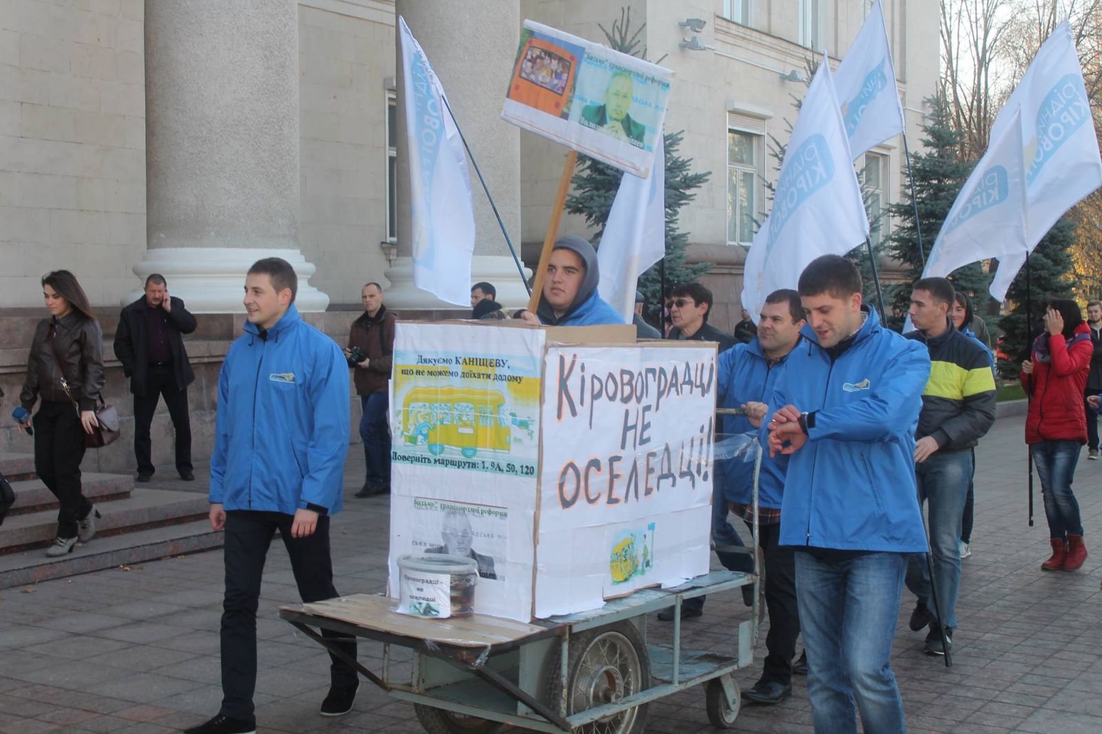 За півгодини до початку сесії міськради на площі перед держустановою зібралися активісти ГО «Рідний Кіровоград», аби передати свої «подарунки» чиновникам у знак протесту проти проведеної транспортної реформи у Кіровограді.