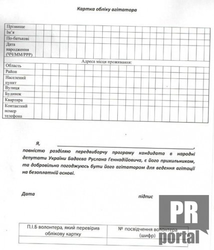 В анкете от граждан требуется поставить подпись под следующим: "Я, фамилия имя отчество, полностью разделяю предвыборную программу кандидата в народные депутаты Украины Бадаева Руслана Геннадьевича, являюсьего сторонником, и добровольно согласен быть его агитатором для ведения агитации на бесплатной основе ".