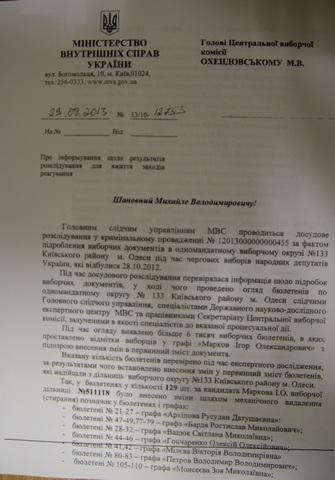 В рамках открытого уголовного производства милицейские эксперты изучили избирательные бюллетени, брошенные в урны округа 28 октября 2012-го года. Они установили факты «корректировки» 6038 бюллетеней, отданных якобы за Игоря Маркова. На самом деле, избиратели голосовали за других кандидатов – Алексея Гончаренко, Русудан Архипову, Вадима Черного, однако после вмешательства неизвестных галочки у их фамилий исчезли, а появились отметки возле имени Игоря Маркова. Фальсификация происходила на 52 участках одновременно.
