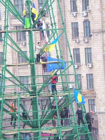 Позже Майдан снова заняли митингующие и забаррикадировали палаточный городок конструкциями елки.