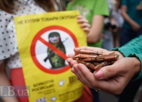 Во вторник в Киеве состоялась акция, во время которой посетителям ресторана, который входит в российскую сеть, активисты раздавали муляжи патронов.