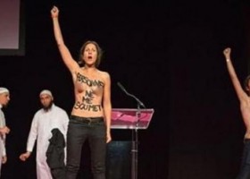 Активістки руху FEMEN з оголеними грудьми увірвалися на мусульманську конференцію в Парижі, де обговорювалися питання ролі мусульманських жінок