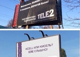 В Алматы, столице Казахстана, появился уже не первый провокационный баннер Теле2. На баннере Теле2 в язвительной форме поздравляет «Дорогой Кисель», то бишь Kcell с наступающим праздником Наурыз.