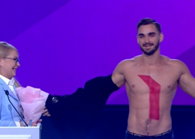 Під час програмного виступу на Форумі "Новий курс України" лідерки фракції ВО "Батьківщина" Юлії Тимошенко невідомий чоловік вийшов на сцену та вручив букет політику після чого зняв футболку.