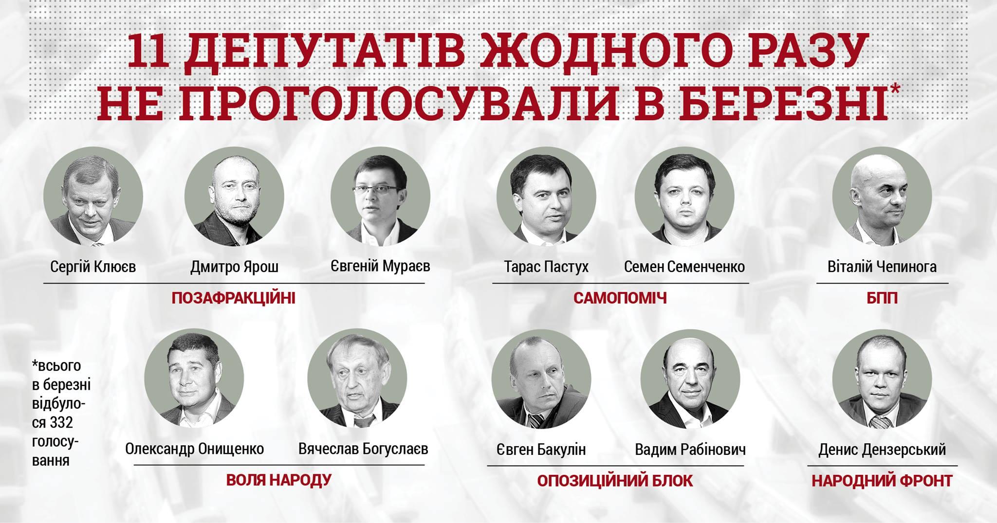 «Окремі депутати фактично виключилися із парламентської роботи. До прикладу, Семен Семенченко в березні не відвідав жодного засідання Ради і, відповідно, ні разу не проголосував. Вадим Рабінович та Євгеній Мураєв, попри активну діяльність поза парламентом, також не голосували в Раді. Для багатьох політикиів відмова від голосування стала своєрідною формою протесту. Проте такі методи не сприяють належній роботі парламенту», - зазначив голова КВУ Олексій Кошель.