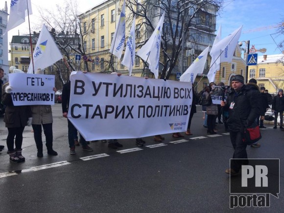 Сьогодні,10 лютого,під стінами Адміністрації президента активісти організації Всеукраїнське об’єднання «Відродження України» провели пікет із закликом «В утилізацію всіх старих політиків!».