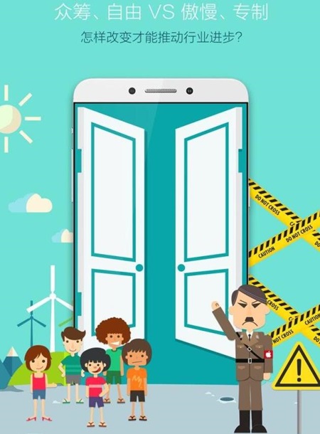 Текст вверху, как пишет издание, осуществившее перевод с китайского, сранивает черты Android и iOS: “Crowdsourced, freedom vs arrogance, tyranny” (“Краудсорсинг и свобода против высокомерия и тирании”).