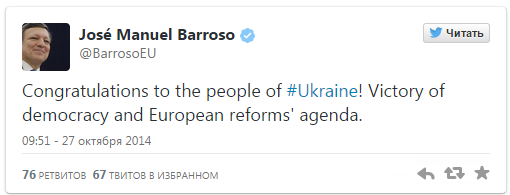 Голова Єврокомісії Жозе Мануель Баррозу привітав український народ з проведенням виборів до Верховної Ради та вважає їх як" перемогу демократії".