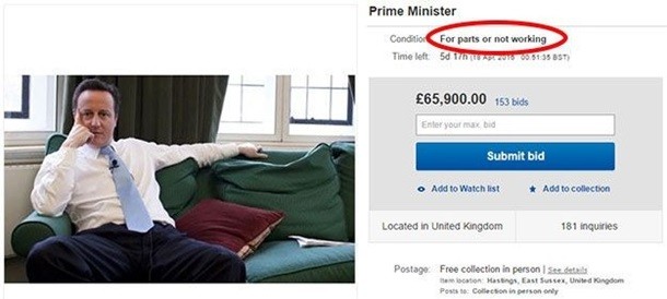 Британського прем'єр-міністра Девіда Кемерона намагалися продати на сайті eBay за ціною £ 65,9 тисяч, передає Mashable. Оголошення було оперативно видалено, однак скріншот пізніше був опублікований на сайті Imgur, повідомляє Корреспондент