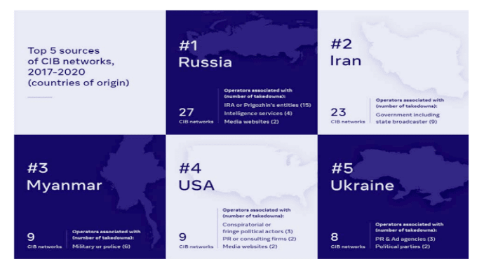 Facebook назвав Росію, Іран, М'янму, США і Україну ініціаторами більшості операцій з дезінформації як всередині країни, так і за кордоном, повідомляє The Washington Post та Voice of America з посиланням на звіт Facebook за 4 роки, у якому розглядається так звана скоординована неавтентична поведінкаFacebook заявляє, що з 2017 року він виявив кампанії з дезінформації в більш ніж 50 країнах.