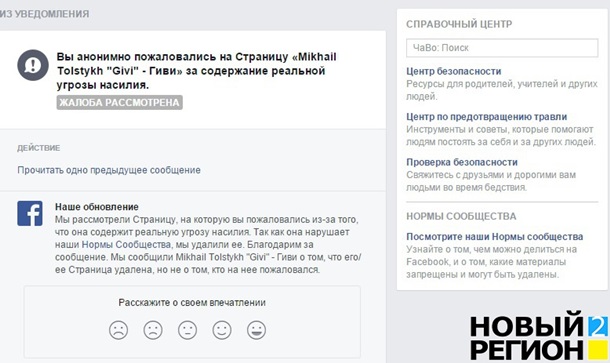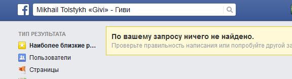 Сторінка "Mikhail Tolstykh "Givi" - Гіві" була вилучена менш ніж через дві доби після публікації блогера і журналіста Костянтина Катишева про те, що популярна соціальна мережа ігнорує скарги на сторінку Гіві.