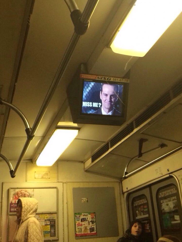 Хакеры разместили фотографию доктора Мориарти из Британского сериала "Шерлок Холмс" с Бенедиктом Камбербэтчем на мониторах киевского метро вечером 14 января.