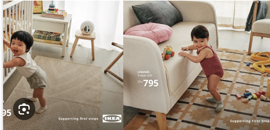 У рамках кампанії «Supporting First Steps» шведський меблевий гігант показує, як діти використовують дивани, тумби під телевізор і стільці як допомогу при ходьбі, коли вони роблять свої перші кроки.