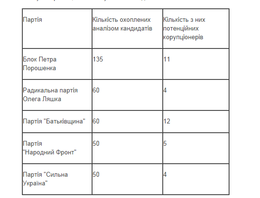 За словами Олексія Хмари, виконавчого директора Transparency International Україна: «Чи не кожен десятий кандидат у прохідній частині партій-лідерів цих перегонів має корупційний слід. Лишилося критично мало часу, щоб керівники партій дотрималися своїх же передвиборчих обіцянок та не провели у нову владу старих корупціонерів. Чи вистачить в них сміливості аби відкликати корупціонерів зі списків та самоочиститися? Про це ми дізнаємося не пізніше як завтра. Наразі м’яч на стороні партійних функціонерів».