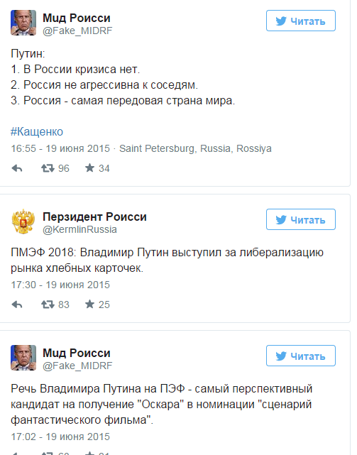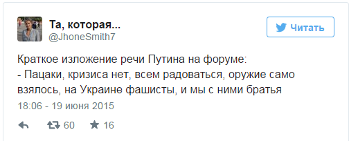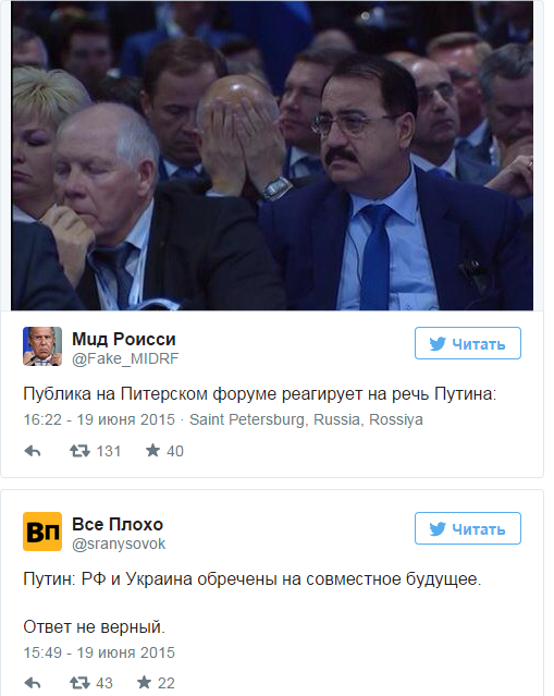 Користувачі соціальних мереж влучно іронізували через сьогоднішню промову президента РФ Володимира Путіна під час засідання Міжнародного економічного форуму у Санкт-Петербурзі.