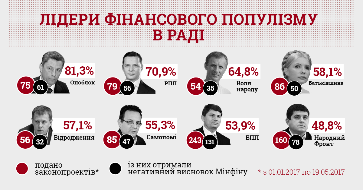 Антилідером рейтингу за кількістю нереалістичних законопроектів є фракція «Опозиційного блоку». За січень-травень депутати Опоблоку подали 75 законопроектів, із яких 61, або 81%, отримали негативний висновок Мінфіну.