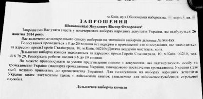 Как сказано в приглашении, "уважаемого Виктора Федоровича" зазывают проголосовать на участке № 800488, расположенного по адресу: улица Героев Сталинграда, 10 (здание Детской академии искусств) — именно сюда последние годы Янукович приходил волеизъявляться. На самом избирательном участке приглашение Януковичу нам прокомментировали кратко: "Он есть в списках избирателей, поэтому ему и было прислано приглашение". Заместитель главы Центризбиркома Андрей Магера также нам сказал, что приглашение было прислано по той же причине. "Он может воспользоваться своим правом, приехать в Киев и проголосовать", — сказал нам Магера. А глава Комитета избирателей Украины Александр Черненко говорит, что приглашения рассылают автоматически. "Да, он в розыске, но есть реестр избирателей, и поскольку его имя в этом реестре значится, то автоматически это приглашение ему и прислали. А право голоса есть у всех, у кого есть гражданство Украины".