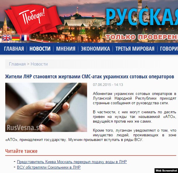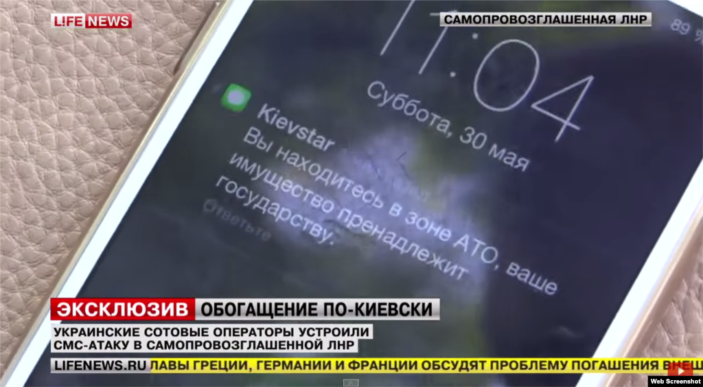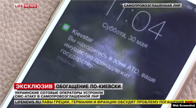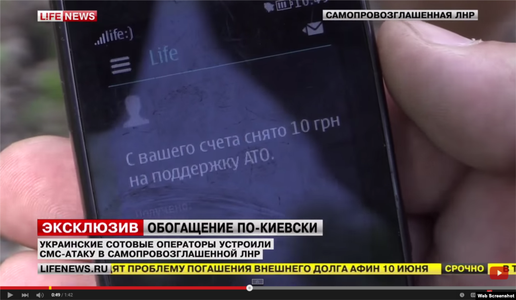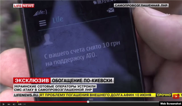 Російський телеканал LifeNews випустив сюжет із заголовком «Збагачення по-київськи», в якому стверджується нібито українські оператори мобільного зв’язку знімають кошти з рахунків мобільних телефонів мешканців окупованих території на підтримку антитерористичної операції на Донбасі, а також влаштовують «СМС-атаки»,повідомили журналісти українського порталу Stopfake.org.