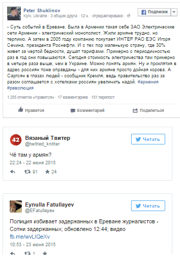 І хоч Майдан в Вірменії та його розгін внутрішніми військами - не тема для жартів, проте користувачі Twitter та Facebook вже встигли поглузувати з реакції Росії на акції протесту та провести аналогії з Революцією Гідності.