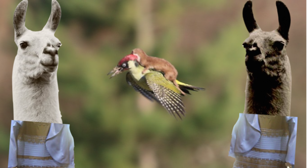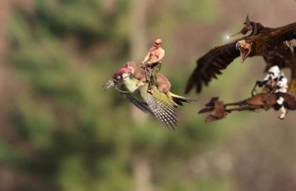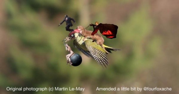 Мережа відразу відреагувала на дивовижне фото і вибухнула фотожабами. На спину дятла "вмостили" російського президента Володимира Путіна, чарівника із "Володаря перстнів" Гендальфа, співачку Майлі Сайрус. Дехто із користувачів навіть використав кадри із кіно та мультфільмів Діснея. На ласці навіть з'явилася сукня, колір якого уже кілька днів поспіль обговорюють у Мережі.
