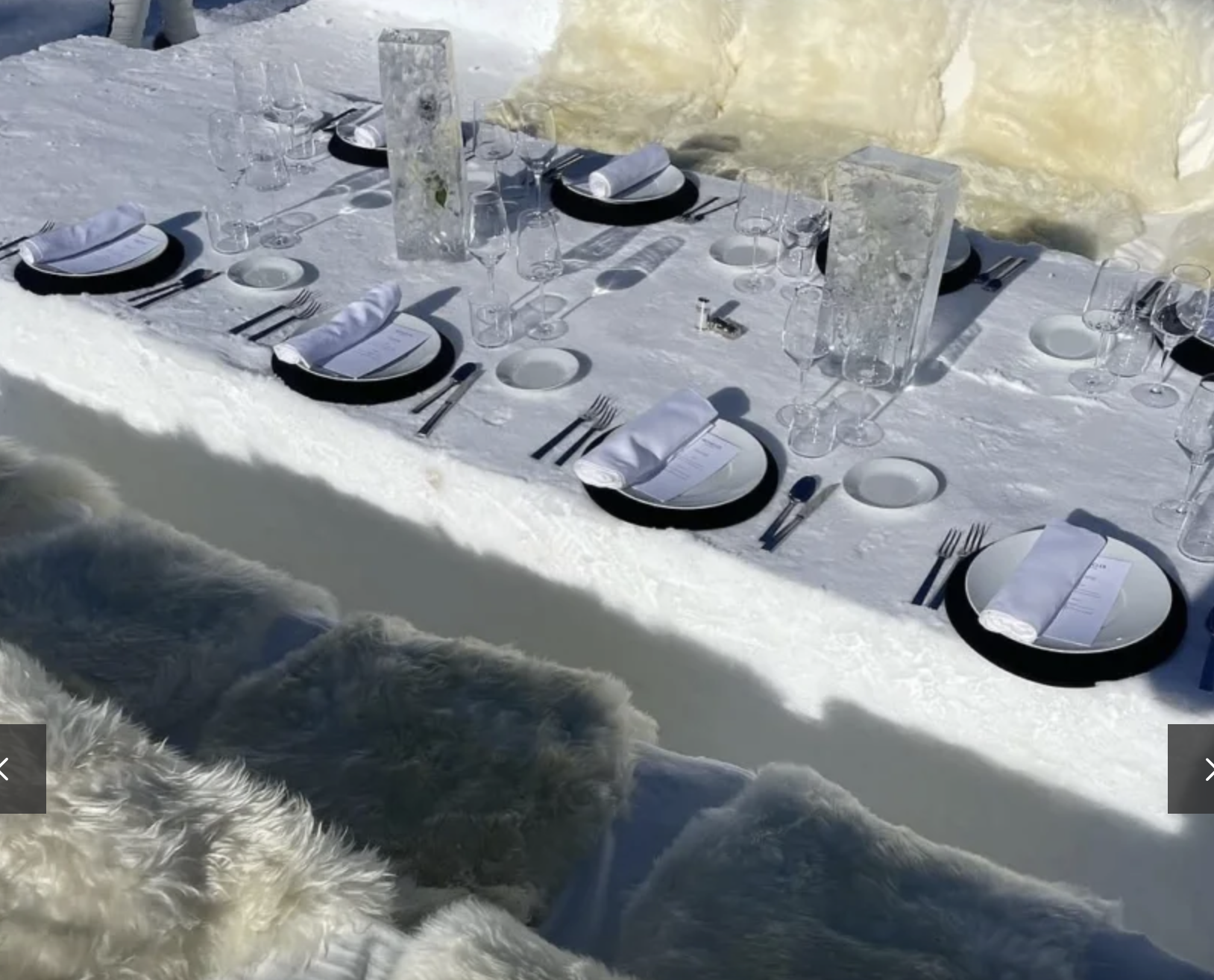 Гостей пригощали обідом, який був поданий на крижаному столі із замороженими квітковими композиціями та затишними хутряними ковдрами, щоб зігрітися.