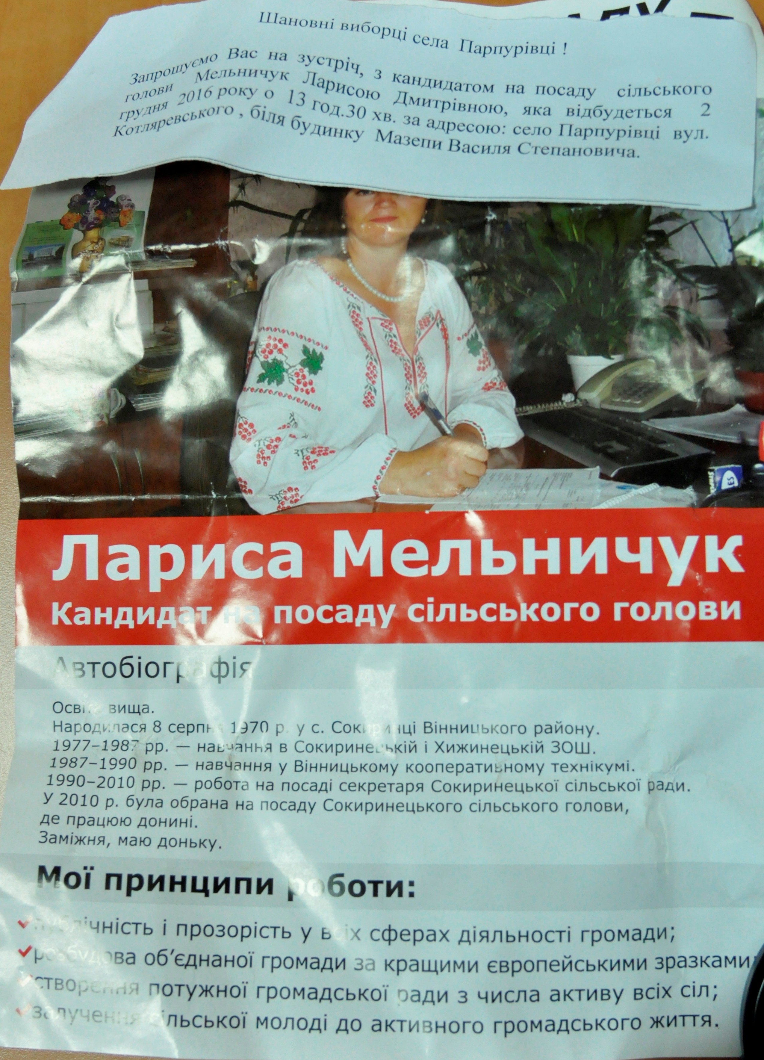 Так, у с. Парпурівці Вінницького району 2 грудня відбулася зустріч виборців із кандидатом на посаду сільського голови Сокиринецької об’єднаної територіальної громади Ларисою Мельничук, яка є кандидатом-самовисуванцем.
