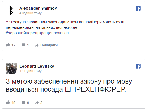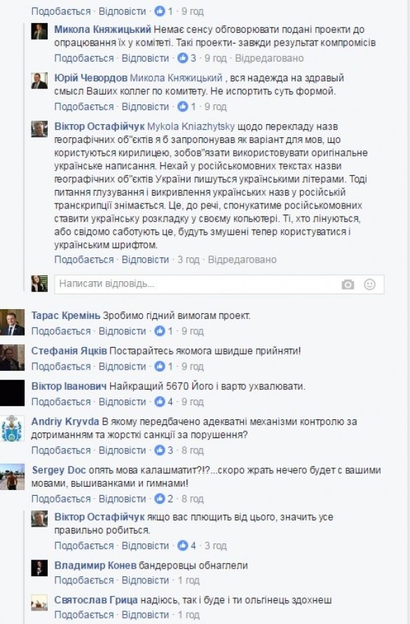 "Тобто після настання вказанних норм чинними, в російськомовних газетах потрібно буде писати "Харкив", "Днипро", "Кыйив", "Кропывныцькый", "апорижжя" й "Одеса" з одним "сы", — написав один користувач під іменем Олексій Копитко, додавши, що "відродяться померлі "товариства захисту російської мови", почнуть верещати борці за свободу слова".
