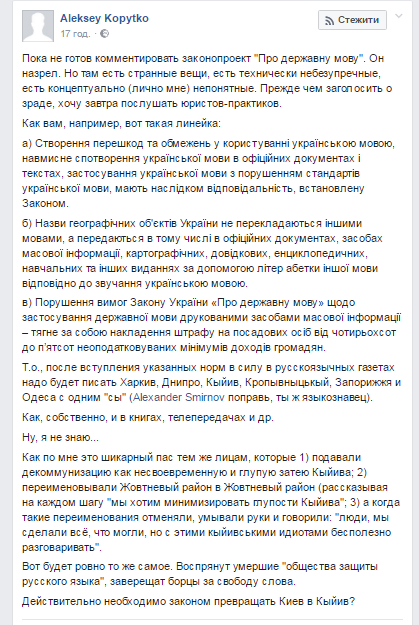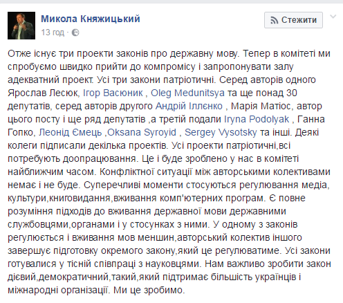 "Отже, існує три проекти законів про державну мову. Тепер в комітеті ми спробуємо швидко прийти до компромісу і запропонувати залу адекватний проект. Усі три закони патріотичні", — написав Княжицький.