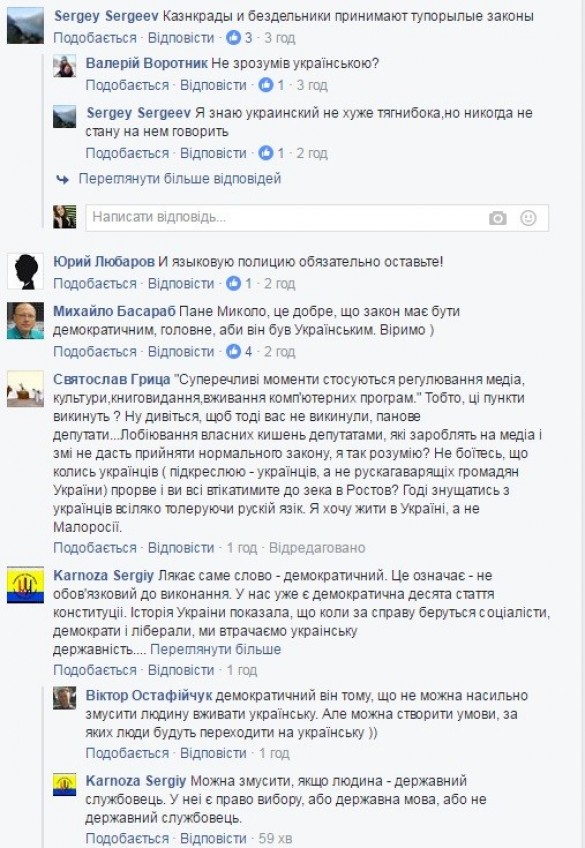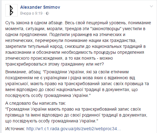 Інший користувач, Олександр Смірнов, обурився таким пунктом в законопроекті: "Громадяни України, які за своїм етнічним походженням не є українцями і рідна мова яких є відмінною від української, мають право на транскрибований запис своїх прізвища та імені відповідно до своєї національної традиції в документах, що посвідчують особу громадянина України."