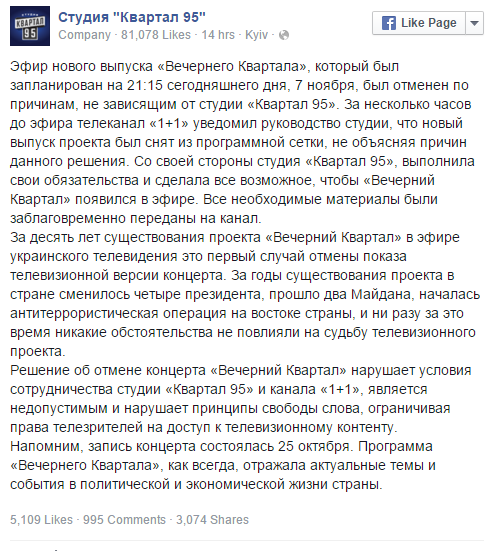 Об этом говорится в официальном заявлении студии Квартал 95, опубликованном на их странице Facebook.
