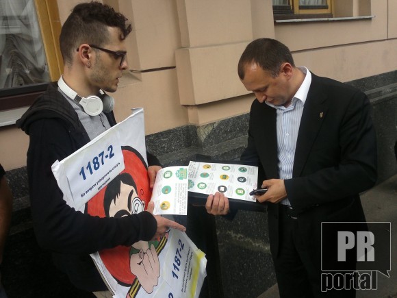 Депутати, які збиралися на засідання Погоджувальної ради лідерів фракцій, зупинялися і вивчали листівку, яку роздавав активіст
