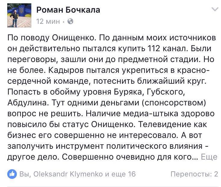 "По данным моих источников он действительно пытался купить 112 канал. Были переговоры, зашли они до предметной стадии. Но не более. "Кадыров" пытался укрепиться в красно-сердечной команде, потеснить ближайший круг. Попасть в обойму уровня Буряка, Губского, Абдулина. Тут одними деньгами (спонсорством) вопрос не решить. Наличие медиа-штыка здорово повысило бы статус Онищенко", - пишет журналист.