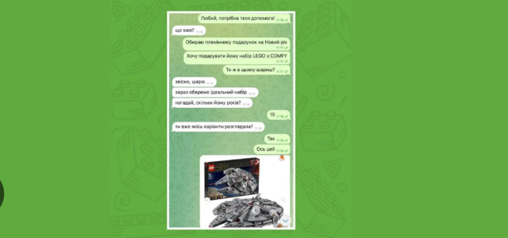В оповіданні дівчина надіслала своєму хлопцю варіанти наборів Lego, які нібито збирається купити на Новий рік своєму племіннику, і питає у нього поради, який краще обрати.