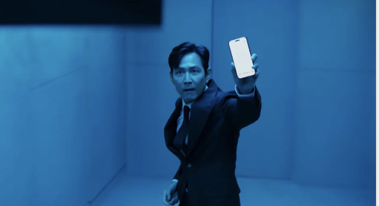 У рекламі Лі робить перерву на знімальному майданчику і опиняється замкненим у коридорі з ретро-телевізором, що звисає зі стелі. Голос з екрану ставить йому три запитання, які нагадують сценарій «Гри у кальмара».