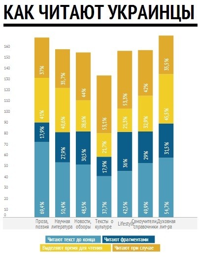 Более 50% украинцев за последний год читали социально-политические обзоры в СМИ, художественную литературу, тексты о жизни звезд. Около 42% читают специализированную литературу, около 40% - самоучители и справочники, чуть более 30% читают тексты о культуре и искусстве, и почти 27% читают духовную и религиозную литературу.