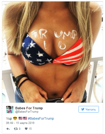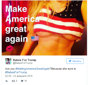 В Twitter появился аккаунт, в котором публикуются фотографии откровенно одетых женщин, выступающих в поддержку кандидата в президенты США Дональда Трампа. Снимки сопровождаются хэштегом #BabesForTrump. Об этом сообщает The Huffington Post.