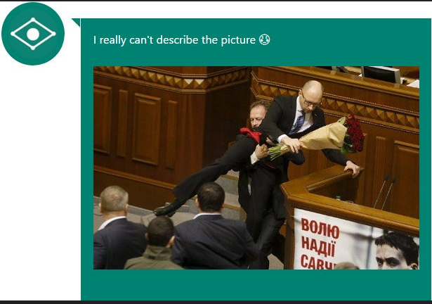 Про знамените фото із Ради, коли нардеп Барна намагався винести Яценюка, робот взагалі нічого не зміг сказати. "Я дійсно не можу описати це фото", - йдеться у підписі.