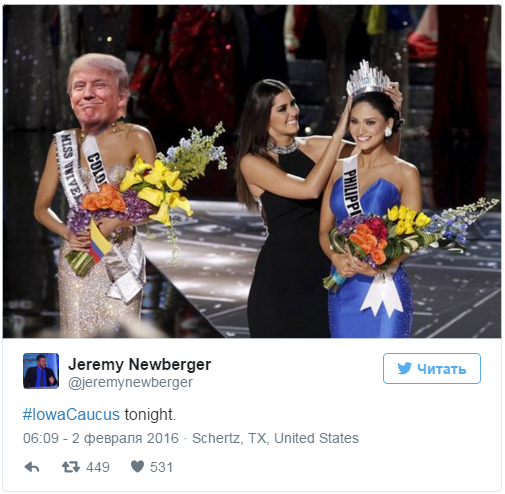 Пользователи соцсетей сравнили миллиардера Дональда Трампа, который проиграл на предыдущих выборах партийных кандидатов от Республиканской партии в Айове, с "Мисс Колумбия" Ариадной Гутьеррес.