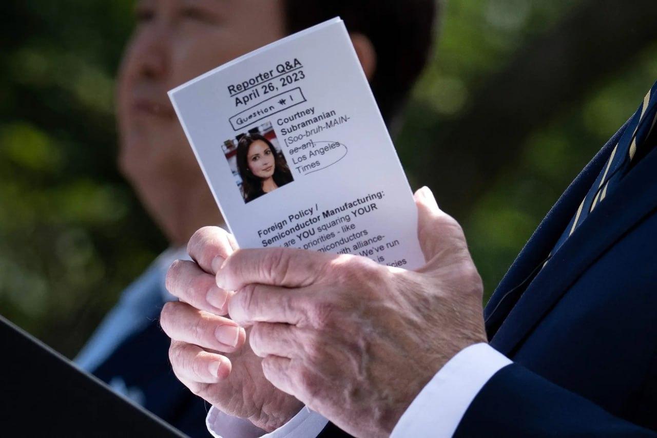 Президент Джозеф Р. Байден-молодший був помічений з довідкою під час прес-конференції в середу, яка виявила, що він заздалегідь знав запитання журналіста.
