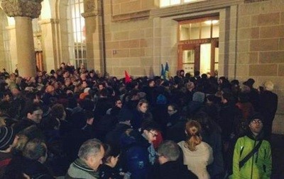 За даними видання, протестувальники зібралися біля входу в університет. Вони тримали в руках транспаранти з гаслами: "Донбас має право на самовизначення" і "Мир! Свобода! Визнання!".