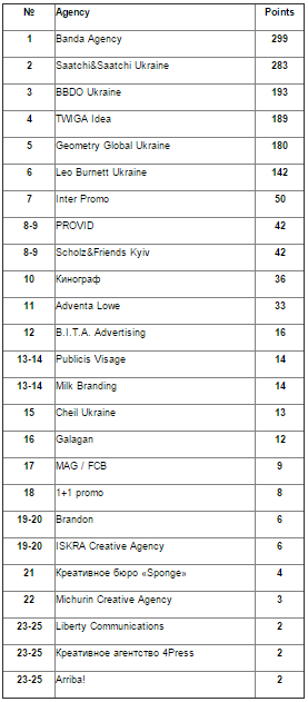 Всеукраинская рекламная коалиция представляет рейтинг креативности и мастерства рекламных агентств по итогам завершившегося фестивального сезона 2014/2015.