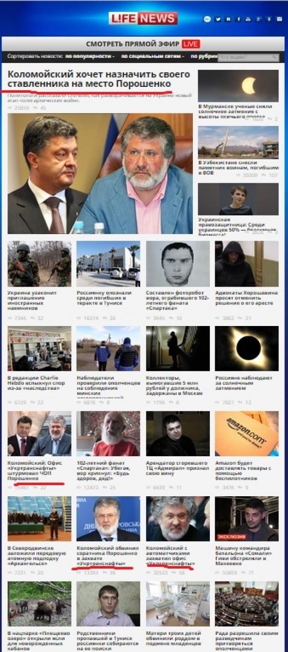 Зокрема головною новиною на сайті Lifenews матеріал з заголовком "Коломойский хочет назначить своего ставленника на место Порошенко". Крім цього на головній сторінці ресурсу скандалу з Коломойським присвячено як мінімум ще 3 новини,повідомляє Еспресо.TV.