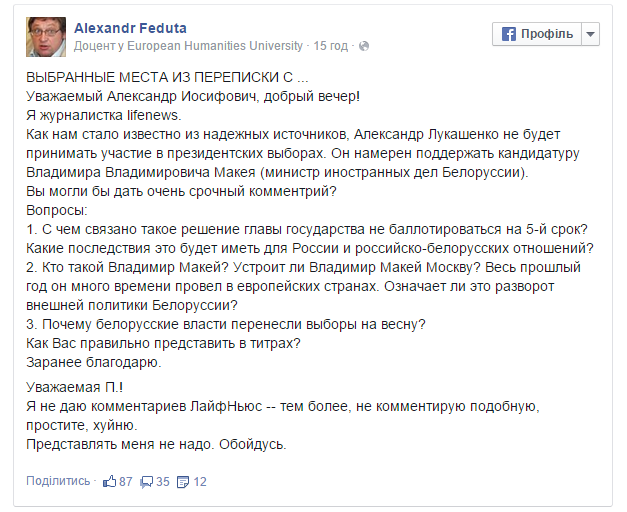 Пізніше з аналогічними питаннями до політолога звернулися журналісти російського видання "Газета.ru". Схожий запит прийшов нібито і від сайту "Медуза".