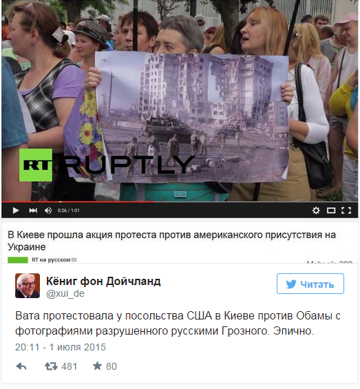 То, что митинги проплаченные, легко определить по дезориентации участников, а также таких ляпах, как плакат с разрушенным городом Грозным. Протест рассчитан только на внутрироссийскую аудиторию - тезис "американцы воюют в Украине против Путина" кажется в Киеве лишенным смысла.