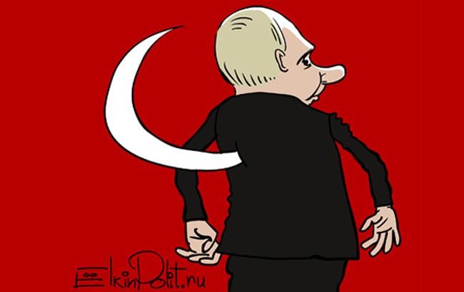 В связи с инцидентом с российским бомбардировщиком Су-24, который был сбит 24 ноября турецкими ВВС, известный российский художник Сергей Елкин создал яркую карикатуру. Рисунок размещен на странице издания "Polit.ru" в соцсети Facebook.