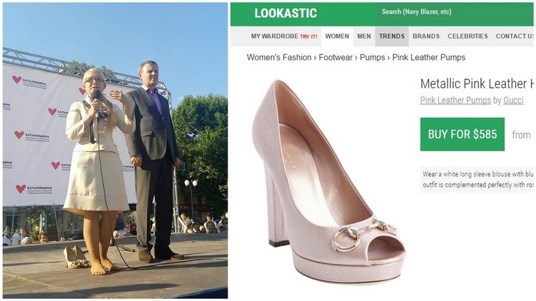 На днях сеть взорвала фотография Юлии Тимошенко из Херсона. Вернее шум наделали туфли, которые она сняла на сцене во время выступления перед избирателями. На снимках можно рассмотреть, что на обуви логотип итальянского бренда класса люкс - Gucci. "Страна" решила найти модель, как у нардепа из "Батькивщины" и выяснила, что стоит пара около 15 тыс. грн.